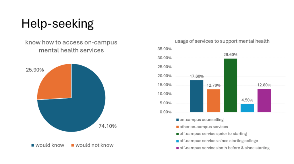 Knowledge of help-seeking was high, with 74% knowing where to get help if they or their friend needed it, and usage of services was fairly widespread between on-campus counselling, other-on campus services, and off-campus services.